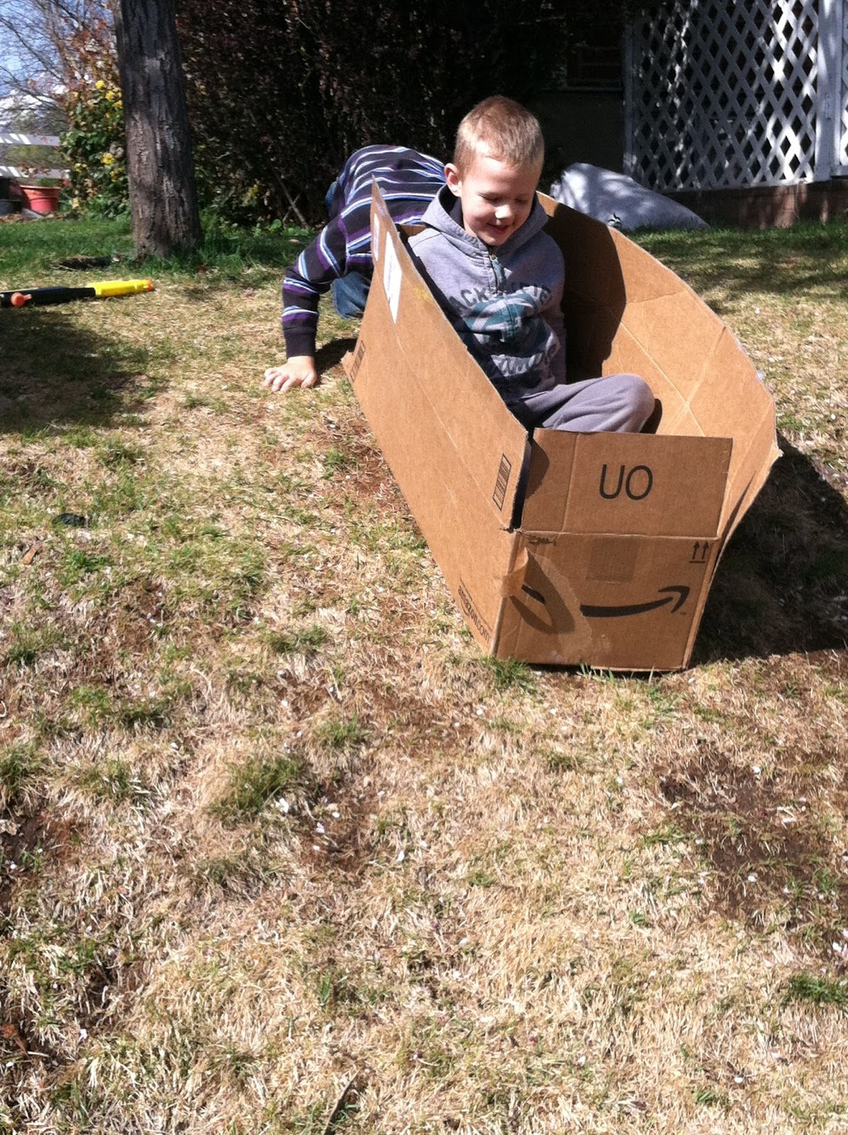 This was our last upgrade to the whole sliding-speed continuum. We tied the bags onto their bottoms and now not only is it the coolest thing to do with a cardboard box, but it's funny too. Ooh I love that my kids think anything involving the word 'bottom' is funny!